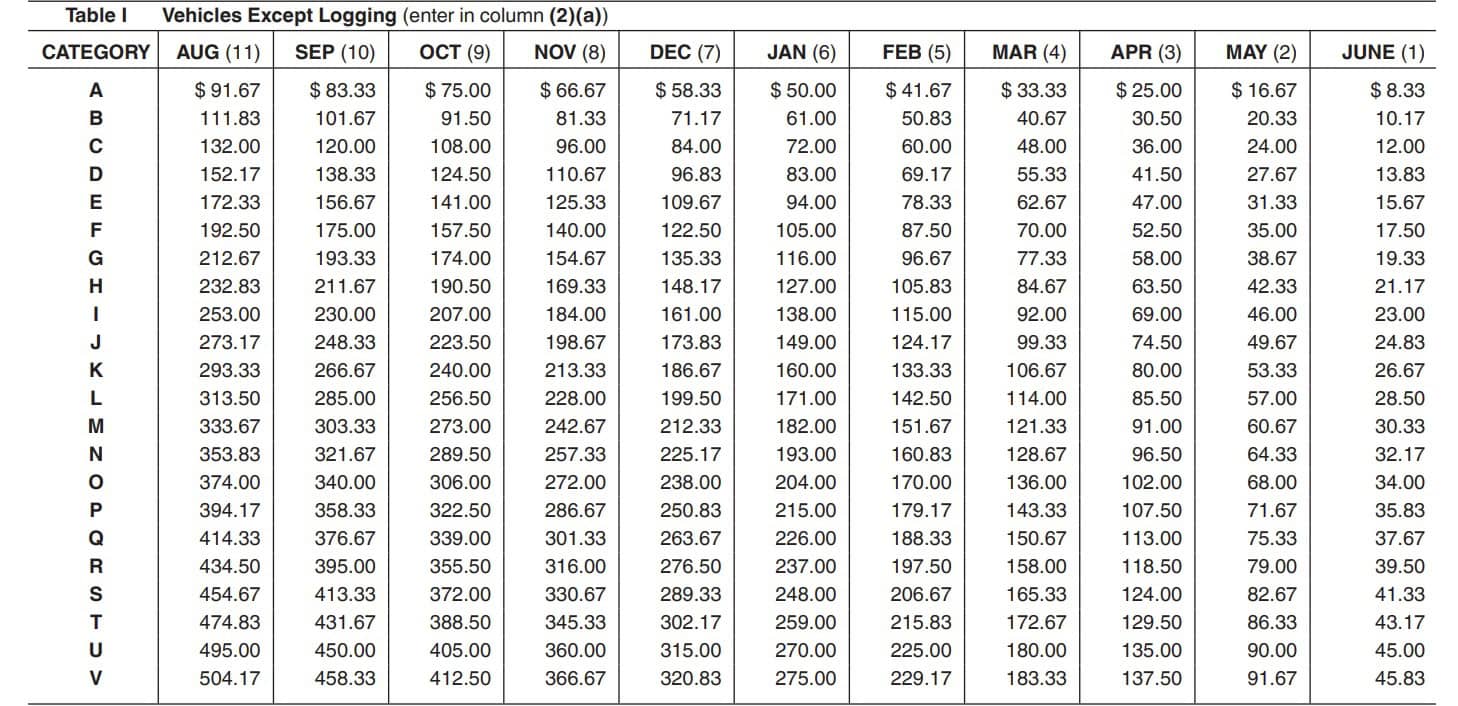 Let’s imagine that you placed a non-logging vehicle weighing 65,600 lbs into service in November 2025. According to the form, this would be a Category L vehicle. Placing the vehicle into service in November would result in a partial-year bill of $228.00 for that vehicle.
