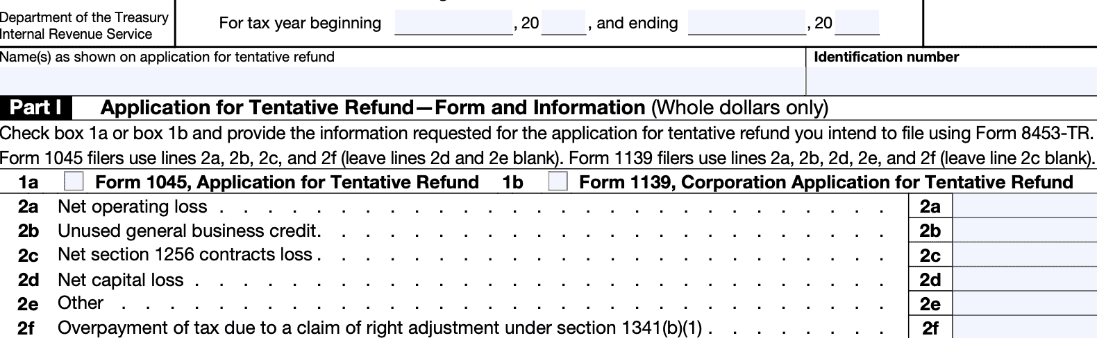 In Part I, we’ll enter certain information from either IRS Form 1045, Application for Tentative Refund, or IRS Form 1139, Corporation Application for Tentative Refund.