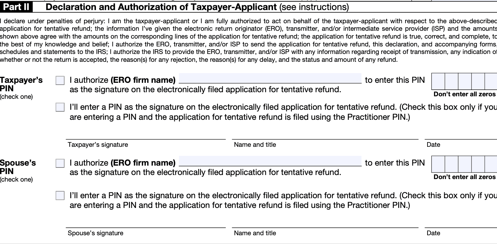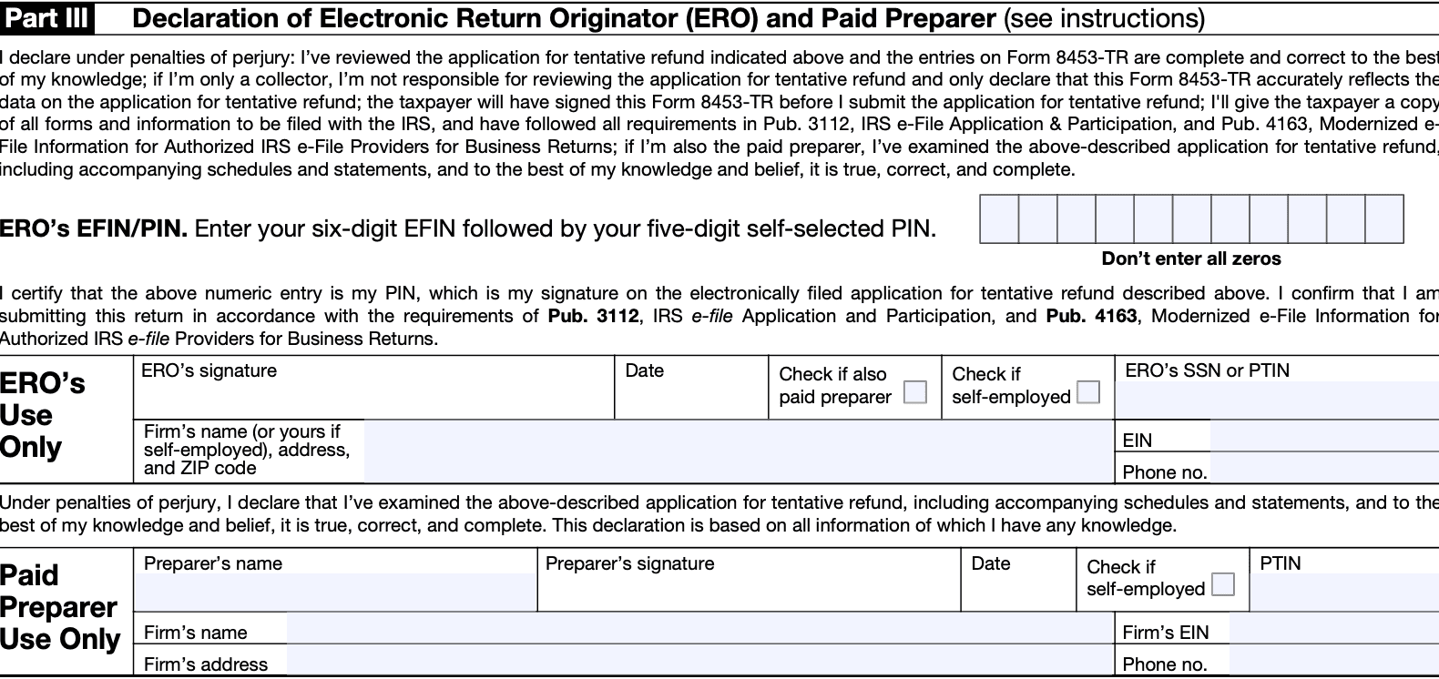 - The application for tentative refund is filed through an ERO and Form 8453-TR is used to select a PIN that is used to electronically sign the application for tentative refund.