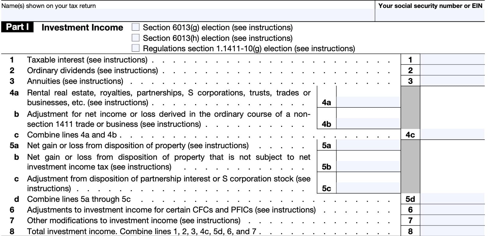 In Part I, we’ll go through Lines 1 through 8 to determine total investment income.